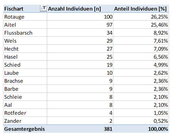 Übersicht der nachgewiesenen Fischarten mit Anzahl der erfassten Individuen und artbezogenem prozentualem Anteil am Gesamtfang (befischte Strecke: 1,0 km).
